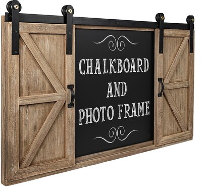 - ATTRACTIVE LOOK: The sliding doors allow you to display your hideaway chalkboard or photos (holds four 4x6 photos and two 4x4 photos). This wall mounted chalkboard has a decorative barn door look.