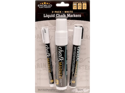 This Excello Global Products set of three liquid chalk markers with white ink is perfect for creating bold and vibrant messages on a variety of surfaces. Assorted tip sizes include a 1-2mm tip, 2-5mm tip, and 7-15mm tip, providing flexibility and versatility for different projects. The liquid chalk formula provides a bright and opaque finish that is easy to read and stands out on dark surfaces. Suitable for use on nonporous surfaces such as chalkboards, glass, mirrors, and more.