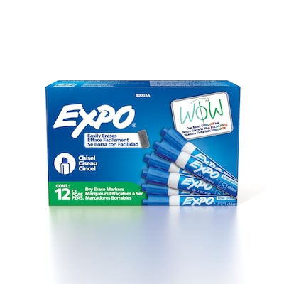 Mark up your whiteboard with both thick and thin lines by using this dozen of Expo chisel-tip blue low-odor dry-erase markers.