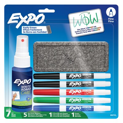 The EXPO Dry Erase Starter Set includes a range of fine point dry erase markers with specially formulated low odor ink. The Expo Low Odor Dry Erase Markers Starter Set has everything you need to get started working on your whiteboard. The set includes an eraser, cleaning spray and 5 fine-tip whiteboard markers in red, blue, green and black. The whiteboard markers feature high-impact ink that’s easy to see from a distance and provides consistent color quality. The dry erase marker ink is specially formulated to be low-odor making it perfect for use in classrooms, offices and homes. Meanwhile, the cleaning spray and whiteboard eraser help keep your surfaces spotless. Use your colorful Expo dry erase marker kit to track, schedule and present.