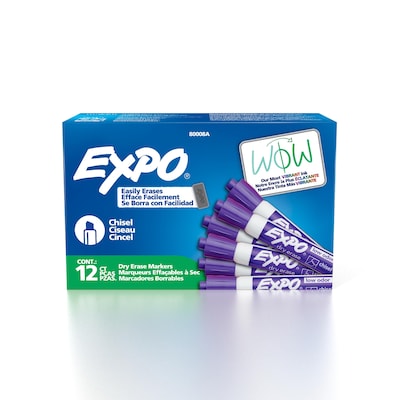 Make a visual impact with this dozen of purple Expo low-odor dry-erase chisel tip markers. Capture ideas, share information, and organize life with vivid EXPO Dry Erase Markers! Now more vibrant than ever, this collection of EXPO markers helps everything come across clearly—from big ideas to fine details. The presentation markers are made for the whiteboard and beyond with ink that pops on glass, acrylic, and other clear, non-porous surfaces. They’re perfect for planning, presentations, lessons, calendars, home organization, and more! Plus, the wide range of colors of these whiteboard markers add versatility and personalization to any of your marking; you’ll be able to accent with a colorful doodle or sketch if you’re a teacher or parent! With an EXPO eraser or dry cloth, the ink erases cleanly and easily, so there’s little pause in any brainstorm session. And the low odor markers are great for classrooms, offices, and homes!