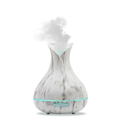 This 2-in-1 essential oil diffuser and humidifier has a White Marble texture and unique vase-shaped design. This diffuser has 7 soothing LED lights to create a calming atmosphere; cycle or steady modes; dim and brighter light options. It also has 4-time setting modes: 1h, 3h, 6h, or continuous. Works silently to help you relax and shuts off automatically when water empties.