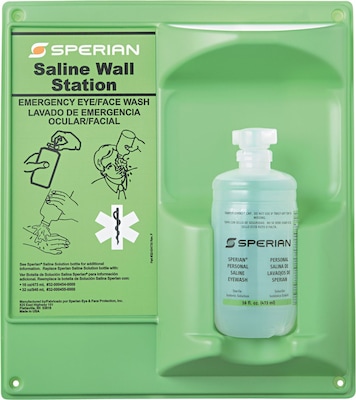 Eyesaline® Personal eyewash single wall stations bottle of 16 oz. is made of plastic for durability. Eye wash station is wall mountable and holds factory-sealed, sterile, preserved or buffered saline solution bottle.