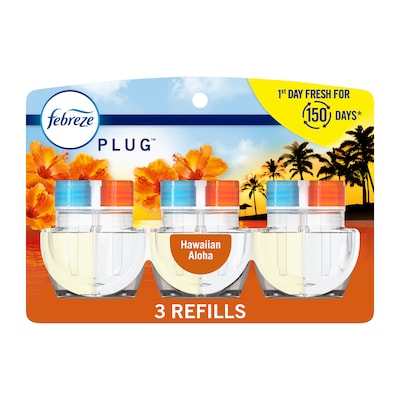 Have you experienced your plug air freshener scent fading? Good news: Febreze Fade Defy Plug Air Freshener stays true to its name, delivering a first day fresh that lasts a full 50 days (on low setting). Ready to hit refresh and be an A+ odor fighter? Just refill the Febreze Fade Defy Plug and plug it into any outlet (they’ll even rotate if your outlet is upside down) in any high-traffic area of your business… the break room, bathroom, or anywhere else odors like to linger. Bonus? When it’s time for a refill, the automatic air freshener will let you know with its handy low-level indicator light. And this scent refill pack comes with three Fade Defy Plug refills so you can keep that freshness going. With the sweet scents of pineapple, melon, peach, and freesia, Hawaiian Aloha whisks you away to your very own all-inclusive island.