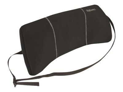 Attach this lumbar back support to chairs to make long sitting sessions more comfortable. The high-density foam provides a thick, cushioned feel, while the adjustable strap ensures that this lumbar back support stays securely in the proper place. This Fellowes lumbar back support features a soft airbrushed cover for a sleek appearance, and the low-profile design makes it ideal for use in professional settings. The Fellowes Lumbar Back Support has a low-profile design for maximum lumbar support. High-density foam promotes neutral posture while the adjustable strap holds the lumbar back support in place. The soft brushed cover can be removed for easy cleaning.
