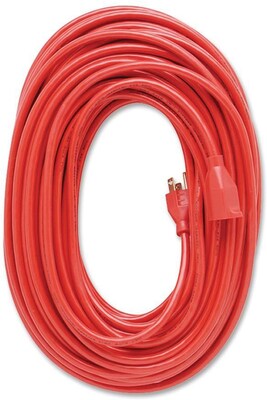 100" heavy duty extension cord is designed for indoor and outdoor use and features a grounded single outlet With a three prong design.