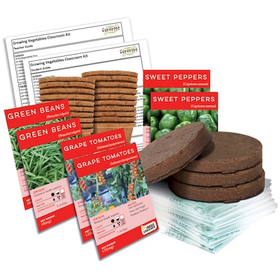 Sprout seeds for 3 kinds of vegetables and plant the seedlings and pot in the garden to grow and harvest vegetables. Comes with everything you need- just add water! For 18 students or groups. Contents include: 18 Biodegradable Pots, 18 Germination Bags, 2 Compressed Peat Disks, Green Bean Seed Pack 7g., Sweet Pepper Seed Pack 5mg., Grape Tomato Seed Pack 50mg., and Growing and Experiment Guide.