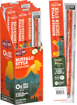 The Field Trip Buffalo Style chicken stick is made from antibiotic-free chicken mixed with Granny Smith apples, red pepper, and chipotle to create a spicy protein snack. Balanced bold flavor to satisfy your cravings on every adventure.