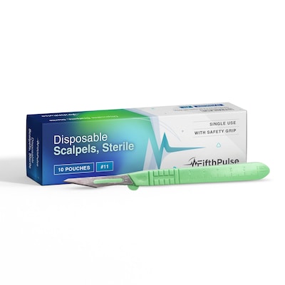 FifthPulse Disposable #11 Scalpels - Sterile, and individually packaged. Each FifthPulse scalpel is made with a premium no. 11 stainless steel blade and a secure, ergonomic handle with markings, to prevent slippage and provide optimum control. Each scalpel includes a protective cap for safe transport, usage, and disposal.