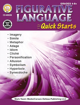 The 64-page Mark Twain Figurative Language Quick Starts Workbook for grades 4–8+ provides students with warm-up activities for the school day ahead. Featuring two to four quick starts per page, this workbook features activities that explain and illustrate each type of figurative language.