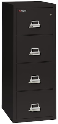These FireKing file cabinets offer a fireproof solution for storing valuable legal-sized folders or documents like wills and business contracts. Each file cabinet is equipped with four drawers that glide smoothly using full suspension, and the charming black color blends well into any work space. The thick and heavy steel ensures toughness and has an impact resistance up to 30 feet.