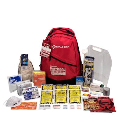 The 1 Person Emergency Preparedness Hurricane Backpack contains the essential survival and first aid supplies for one person for up to 3 days