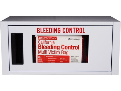 Keep your building compliant with California regulation AB2260 with this First Aid Only Right Response bleeding control cabinet. This cabinet contains a multiple-victim bag with six 91519 plastic bleeding control kits. The included alarm will sound when opened, alerting those nearby of an emergency. The efficient bag is a cost-effective solution to keep new buildings in California up to compliance. Includes all required components for the AB2260 regulation standard.