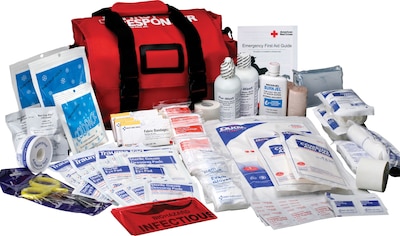 Large first aid kit includes CPR devices, dressings, bandages, tapes, biohazard bags, gloves and more.