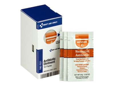 First Aid Only™ Antibiotic ointment comes in a single-use packet that allows you to apply medicine quickly to affected areas, sold as 10 per box.