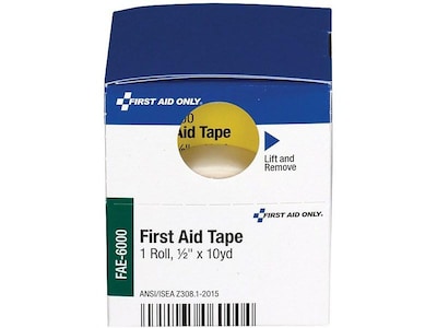First Aid Only® First aid tape refill make cabinet easy to use and restock. First aid tape adhesive is hypoallergenic that reduces the chances of skin irritation. Secure dressings and bandages with first aid tape that is durable, yet tears easily without shredding. The 10-yard roll provides reliable holding on skin with gentle removal. This item meets ANSI/ISEA Z308.1-2009 standards.