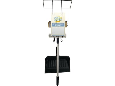 The First Aid Only Spill Magic mountable wire rack spill response station holds everything needed to quickly respond to a spill. The system includes a broom with 40" telescoping handle, clip-on dustpan, and a trash liner roll.