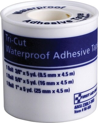 First Aid Only™ Tri-cut waterproof tape features plastic-spooled design to perform easy measuring, cutting and application. Tape with strong adhesive has 3-in-1 design to select from one of three sizes 1", 5/8" or 3/8" x 5 yd.