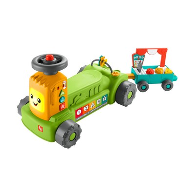 Your baby can ride, park, and roll into farm-fresh pretend play with the Laugh & Learn® 4-in-1 Farm to Market Tractor™ ride-on learning toy from Fisher-Price®. This interactive toy tractor with pull-along market wagon has fun lights, music, and 4 ways to play as your little farmer grows from infant to toddler. Switch up the learning as your baby grows with 3 Smart Stages® levels that teach the alphabet, counting, shapes and more. Requires 3 AA batteries (not included).
