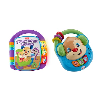 Open up a world of fun and learning for your baby with the Laugh & Learn Storybook Rhymes from Fisher-Price. Each page of this musical toy book features colorful illustrations featuring Puppy and Sis. As baby turns the pages, they'll hear childhood favorite songs like "Pat-a-Cake" or "Row, Row, Row Your Boat," as well as learning songs about counting, first words, letters, shapes and more. With its easy-carry handle, little "readers" can take Storybook Rhymes everywhere they go. "Puppy's ready to party, and he's got the beats to get your baby bopping! With the press of one of the three colorful buttons, the Laugh & Learn Sing & Learn Music Player comes to life with lights, songs, and phrases that introduce the alphabet, shapes, colors, and numbers. This pretend radio toy has an easy-grasp handle, so baby and toddler music lovers can bring the beats along wherever they go!
