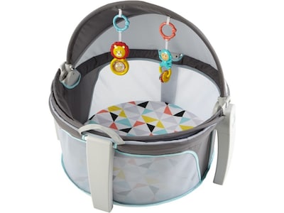 Baby feels right at home in the dome. That's because this Fisher-Price On-the-Go baby dome features a comfy pad for your little one to nap on or play on and a canopy that protects a baby from the sun and bugs, so you can use it indoors or out. Two colorful toys dangle overhead to encourage eye tracking. The toys can be removed and placed within your baby's reach for exploring the textures. And when you're ready to pick up and go again, just fold the dome and use the handles to take it with you. It's a great take-along for camping, picnics, a day at the beach, play dates, or a visit to grandma's house.