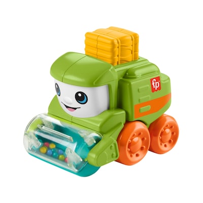 Get play time “growing” with the Rollin’ Tractor baby toy from Fisher-Price. Styled like a real harvesting machine, this push-along tractor features bright colors, a friendly face and colorful spinner beads that rattle as baby rolls the vehicle along. The combine's hay bale makes a fun squeaking noise when pushed down too. All this activity encourages babies to crawl along, helping to develop those all-important fine and gross motor skills.
