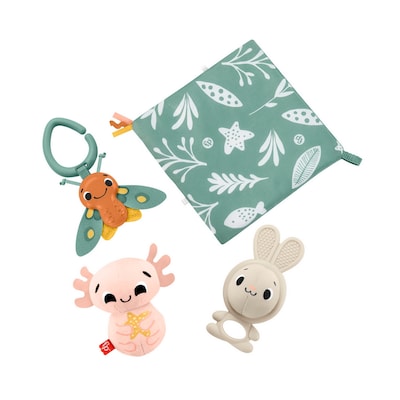 Newborns will love the sensory fun of the So Many Senses Gift Set from Fisher-Price. This set of 4 baby sensory toys includes a BPA-free bunny teether with pop-out jingle ball, a soft axolotl with chime, a textured moth rattle, and a soft fabric crinkle panel with ribbon tag. Designed to be easy for little hands to grasp, these toys help strengthen fine motor skills while fostering a baby's developing senses of sight, hearing and touch. Moth and crinkle panel easily attach to a baby gym, diaper bag or stroller with a convenient link for travel use. Toy set comes in a decorative package perfect for a baby shower or sprinkle.
