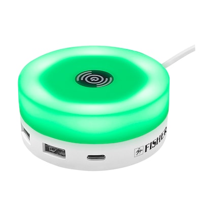 The FISHER Tech Essentials 4-in-1 Wireless Charging Hub provides wireless charging for your Qi-compatible device, plus 3 USB ports for wired charging of 3 additional devices. There are 2 USB-A ports plus 1 USB-C. Built-in LED lights offer 5 colorful light modes. Declutter your desktop or nightstand and charge multiple devices together - and do it in style.