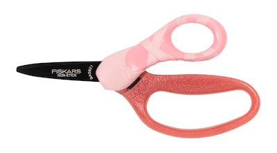 Fiskars MVP Pointed-tip Non-stick Kids Scissors are thoughtfully designed for small hands and creative minds, with safety-edge blades, a pointed tip for improved detail cutting, and a handle featuring special textures and colors that reflect dance. Teachers and parents love how easily the non-stick blades cut through all classroom materials, even sticky items like tape, as well as their innovative, safety-edge with a safer blade angle. A larger finger loop and an ergonomic thumb loop provide a natural, comfortable fit for kids' fingers. An optimized opening angle helps kids open the blades without losing their grip for improved control. Additionally, the handle is built to be in-line with the blades to allow for better precision while cutting in the air. These scissors are ideal for children four and up, because every creative genius deserves the right scissors at the right age to express themselves.