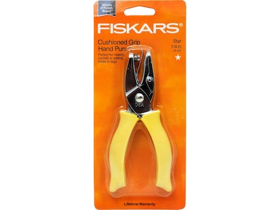 Create professional-looking star cuts with this hole punch. The cushioned extended handle is easy to hold and built to ease hand cramping that can result from long-term use. This durable Fiskars star hand punch features a built-in confetti catcher, letting you keep your work area clean from clippings.