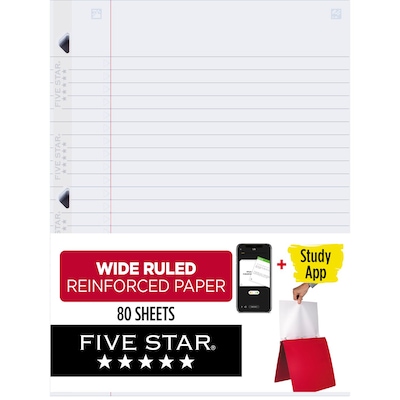 Five Star Reinforced Wide Ruled Filler Paper, 8" x 10.5", 3-Hole Punched, 80 Sheets/Pack (150002/150034)