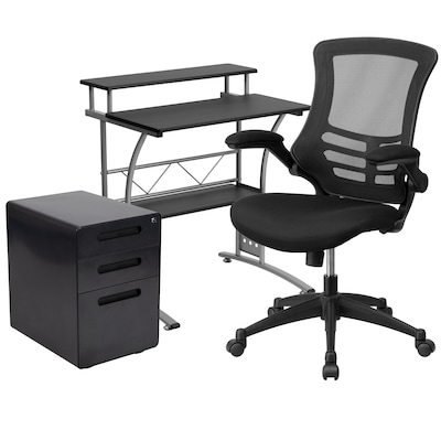 Who says compact office suites can't be functional" Add a contemporary look to your office with this desk and chair bundle. You'll be able to keep up with your daily demands effectively with the ergonomic mesh back office chair and pedestal storage. Hand selected for your shopping convenience, this office set includes a desk chair, computer desk and filing cabinet. The modern computer desk has a raised shelf for your monitor while the main surface holds your keyboard and mouse or laptop. The ergonomic mesh office chair will make your workday more enjoyable with its curved backrest, padded waterfall seat and flip-up arms. Reduce the clutter on your desk by filing away documents inside the 3-drawer filing cabinet. The hanging file drawer holds A4, letter, legal and F4 hanging folders. Two small utility drawers hold your small office accessories. Get your workplace office bundle set today.