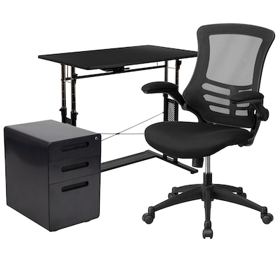 You'll feel like a boss after furnishing your home office with this 3-piece office suite. Hand selected for your shopping convenience, this office set includes a desk chair, computer desk and filing cabinet. The ergonomic office table adjusts 27.25"-35.75"H for standard office chair and draft chair seating. Make bold moves on this sleek looking adjustable desk that adjusts to your preferred working height. Unlock the clamps and push in lever to raise the frame, then snap the clamps back into place for a sturdy worksurface. The ergonomic mesh office chair will make your workday more enjoyable with its curved backrest, padded waterfall seat and flip-up arms. Reduce the clutter on your desk by filing away documents inside the 3-drawer filing cabinet. The file drawer holds A4, letter, legal and F4 hanging folders. Two small utility drawers hold your small office accessories. Get your workplace office bundle set today.