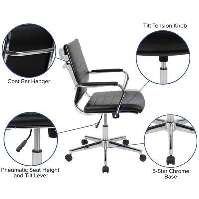 - 4 Mid-Back Black LeatherSoft Ribbed Conference Chairs with Padded Chrome Arms: 27.25"W x 27.25"D x 35-38.5"H