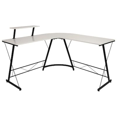 Today's challenges have more people working from home than ever before. This L-shaped corner desk can handle anything your workday throws at it. The corner hugging design takes away the need for lots of floor space. Featuring a raised monitor stand that can be attached on either side, this home office computer desk allows you to have several monitors. Add wide monitors or TV screens for a full gaming experience. The spacious work surface has enough room for your gaming console and controllers, laptop and other necessities. Place your custom gaming PC under the desk and still have plenty of legroom. This contemporary home computer desk has a white textured top that sits atop an open black powder coated frame that holds up to 175 lbs. Self-leveling floor glides will ensure your platform stays stable. Quick assembly, easy cleaning and great versatility make this home computer desk an ideal choice.