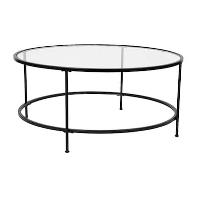 Lend any space in your home a sophisticated, polished look with this round clear glass coffee table with matte black steel legs. The round top and frame contrast with the vertical legs to provide a contemporary look that's sure to tie any trendy room's presentation together. The round design is perfect for an L-shaped sectional, two wingback chairs or the sofa in the family room. Not only does its ample surface area serve as a convenient space for holding belongings, it's also great for displaying magazines, newspapers, and keepsakes. Glass offers a distinct, upscale look while providing superior strength that won't break even after heavy-duty use. Fixed floor glides prevent damage to your flooring and enable easy movement. Quickly remove dust or spills with a water based cleaner. Add a pair of our glass end tables with matte black frame to pull your design together.