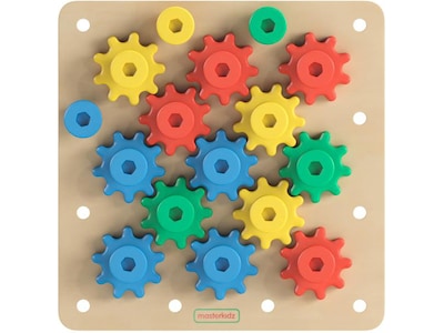 - Board is made of birch plywood in a natural finish and features brightly colored stackable plastic gears