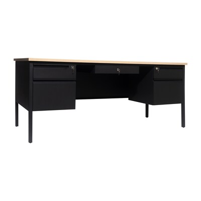 Give teachers and office workers alike a dedicated space for their tasks that is both functional and professional with this commercial grade double pedestal desk. Featuring a 1" thick long-lasting laminate top, steel frame, and 5 locking drawers with ball bearing drawer slides, this multipurpose desk will stand up to the rigors of daily use. The premium materials allow this metal and wood desk to hold up to 300 lbs. static weight while the self-leveling floor glides ensure a level work surface. Assembly takes 30 minutes or less and a damp cloth is all that is needed to maintain the appearance of this must-have work space.