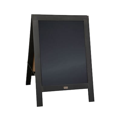 Welcome guests to your restaurant, retail store, birthday party, or baby shower with the vintage vibe of this indoor/outdoor wooden framed message board. Place this chalkboard on the sidewalk to advertise your daily specials or place inside your venue to direct wedding guests to the correct reception area. Constructed from solid pine, this wind resistant sandwich board features heavy duty hinges and security chains on both sides. The double sided, non-porous, magnetic chalkboard display is designed for regular chalk as well as liquid chalk and cleans easily with a damp cloth. At the end of the day you can fold this freestanding easel, available in multiple finishes, flat for storage or transport.