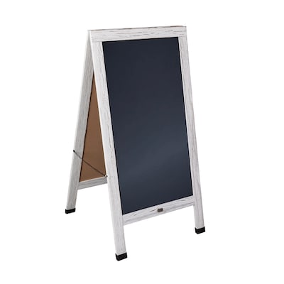 Everything you need to welcome guests to your restaurant, retail store, birthday party, or baby shower is included in this indoor/outdoor wooden framed message board set available in 6 colors. Create your custom messages and place this chalkboard on the sidewalk to advertise your daily specials or inside your venue to direct wedding guests to the correct reception area. Constructed from solid pine, this wind resistant sandwich board features heavy duty hinges and security chains on both sides. The double sided, non-porous, magnetic chalkboard display is designed for regular chalk as well as liquid chalk and cleans easily with a damp cloth. This set includes 8 chalk markers, 10 stencils and 2 magnets to get you started and wipes clean with a damp cloth.