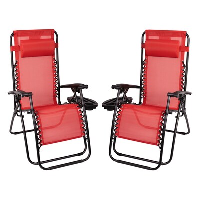 Have the most comfortable seat in the whole neighborhood with this set of 2 red zero gravity chairs. This zero gravity recliner chair is designed to suspend your body in a neutral posture, elevate your heart and decompress the spine to help alleviate back and muscle pain that can come from stress or strenuous workouts. The solid metal frame holds up to 250 lbs. to accommodate most users while the breathable mesh back and seat keep you cool. The drink tray attaches to either side of the chair to hold a cool drink, your tablet, phone or any other accessories. The adjustable headrest moves up and down to adapt to your needs. Chair folds upright for storage and portability. This outdoor gravity lounge chair comes fully assembled. Experience a weightless sensation that will release tension and allow you to relax and let go of the stresses of the day.