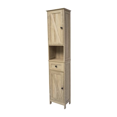 Farmhouse style and practicality align beautifully in this bathroom linen tower cabinet. This is the perfect choice for small spaces and adapts to any room in your home. Make a statement by showing off this freestanding cabinet organizer built from premium materials, including sturdy engineered wood with premium metal hinges and door handles. The fashionable, farmhouse look boasts a crowned decorative top. Behind each of the two cabinet doors of this storage cabinet organizer is an adjustable shelf and each door features a magnetic closure. The addition of an open display shelf and drawer doubles as extra storage space or as the perfect display platforms. All shelves hold up to 55 lbs. static weight and the adjustable anti-tip anchors at the top of the cabinet allow space for baseboards. Assembly is quick and easy, typically taking under 60 minutes and maintenance only requires a damp cloth.