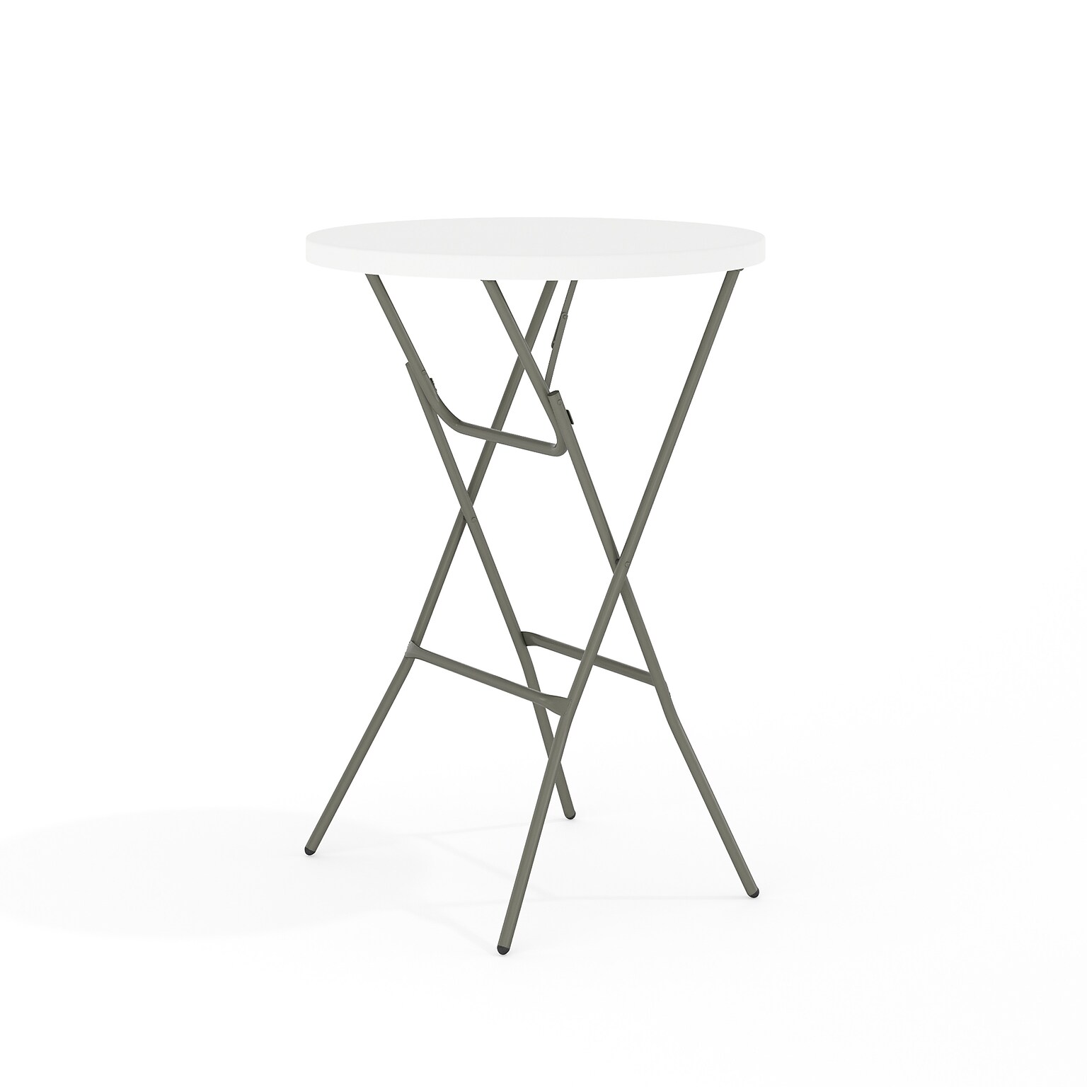 When you need a little extra surface area this folding bar height table is the perfect choice. This plastic folding table is a convenient option when you need to set up tables for special events, cook-outs on your patio at home or when you're serving snacks around the pool. Use during events as a mixing bar and pair with table height tables for a touch of elegance. This durable, easy to clean table is commercial rated for use in banquet halls, convention centers and at trade shows. The thick, granite white tabletop is 1.75" thick, and will comfortably seat up to 3 adults. Its waterproof, impact and stain resistant top have a 165 pound static load capacity. Non-Locking bar height gray powder coated cross legs fold to transport and store. Non-marring floor caps protect your floor by sliding smoothly when you need to move it. The 32" Round Granite White Plastic Bar Height Folding Table is a convenient option for your next home, school or business event. Designed for both indoor and outdoor use, store table indoors and protect the frame from extreme moisture.