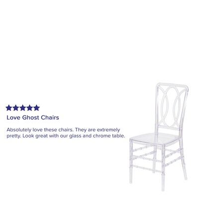 Take your seating options to the next level and impress future clients with the ethereal look of the crystal ice chair. There should always be strength behind beauty and this event chair has both to spare. Constructed of ultra-strong polycarbonate, this special occasion chair is shock, scratch and water resistant will hold up to 800 pounds to accommodate most users without wobbling. The intricate back design makes an elegant statement in any venue and is UV resistant to resist fading as outdoor events become more commonplace. These chairs ship fully assembled, and can be stacked 10 high for storage. With its durable, lightweight construction and classic styling, this beautiful chair will become the prime seating choice for all of your special events, from casual to elegant.