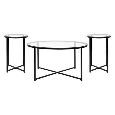 Add an upscale look to any room in your living space with the effortless style of this 3 piece coffee table set. Featuring crystal clear glass tops, this occasional table set lends an open feel to any space. The round shape atop modern crisscross matte black metal legs completes the look of these stunning pieces. Whether you're serving coffee or just want a place for decorative items, you never have to worry about the safety of these tables. Strong, 6mm tempered glass resists breakage while the sturdy cross brace metal frames keep your possessions secure. A durable powder coated finish ensures this living room table set will look great for years. Have your new tables ready to use in under 30 minutes with the included step-by-step instructions. Floor glides will protect your hard flooring surfaces and messes clean up quickly and easily with a water based cleaner.