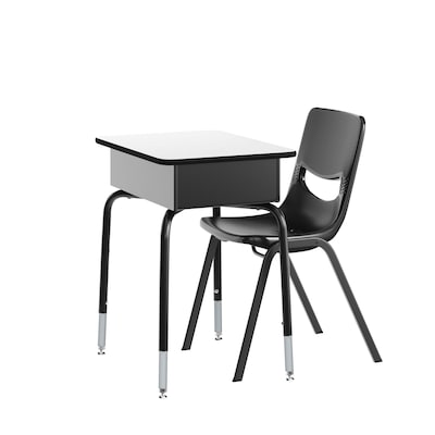 Keep your students comfortable with this classroom desk for all ages and chair for students 12+, perfect for schools, libraries, and home-schooling spaces. The desk features a metal open book box that attaches to a specialty crafted crisscross frame at five points. The desk has a high-pressure surface, laminate top, and lacquer edge treatment. Wide, adjustable legs are compatible with the chair on the three highest settings. The chair’s ergonomic flex back promotes good posture and comfort. The vented back/seat allow for airflow. These chairs stack up to 18 high. Adjustable nylon floor glides on the desk and fixed floor glides on the chair are designed to protect hard flooring surfaces from damage. The desk and chair both feature a steel frame for static weight capacities of 300 lbs. and 500 lbs., respectively. The desk assembles in 30 minutes. The chair arrives preassembled. Both pieces clean with a water-based cleaner.