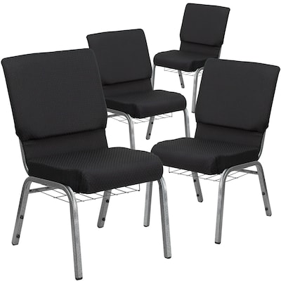 Flash Furniture HERCULES Series Fabric Church Stacking Chair w/ Book Rack, Black/Silver Vein Frame, 4 Pack (4FCH185SVJP02B)