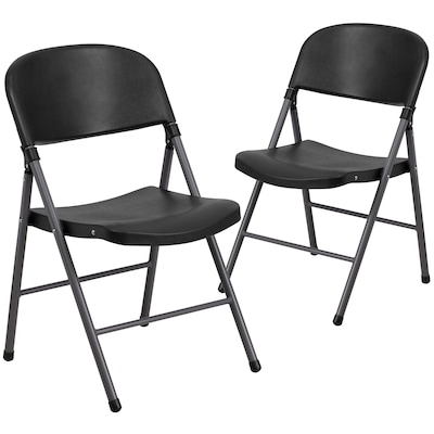 Feel free to host holidays this year or plan a perfect event or gathering with this black plastic folding chair with charcoal frame. A molded seat provides comfort to guests while the heavy-duty frame supports up to 330 lbs.. The textured seat ensures safe and comfortable seating. After use, place the chairs from the two-pack on top of each other or in a row. You'll always have extra seating on hand for guests for a game night, party, and Thanksgiving or Christmas dinner. The plastic chair offers a versatile seating solution while being easy to maintain and is designed for portability.