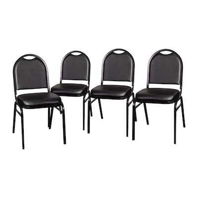 Be ready for any event or occasion with the stylish look of this banquet chair ideal for both casual and formal events. Built for the commercial industry these trapezoidal back banquet chairs with 16 gauge steel frame have been tested to hold up to 500 pounds. With a high seating capacity these stack chairs are perfect for the event rental business, banquet halls, churches, and schools. This hospitality chair can be dressed up with chair covers. The chair is cushioned with 1.5" thick CAL 117 fire retardant foam and is covered in a durable, easy to clean vinyl upholstery. Recommended stack height is up to 10 chairs high and non-marring floor glides protect your floor. This stacking upholstered stack chair is an excellent option for any commercial setting. Add banquet chairs to your home dining table to add a contrasting look to your dining room or kitchen.
