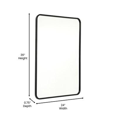 Instantly refresh any room in your home with this 24" x 36" rectangular wall mount mirror. The modern design boasts a slim, matte black metal frame that lends an up-to-date look to almost any decor. HD glass with real silver backing provides high reflectivity for a distortion-free image. Safety minded for today's busy households, the shatterproof backing technology ensures the glass stays put in the frame when breakage occurs to prevent cuts to children or pets. The waterproof and rust-resistant design make this large mirror ideal for use in high humidity areas such as bathrooms, kitchens, and sheltered balconies. Hang this accent mirror vertically or horizontally to suit your personal taste with the included mounting hardware. Wipe clean with a damp cloth to keep your new mirror looking great.